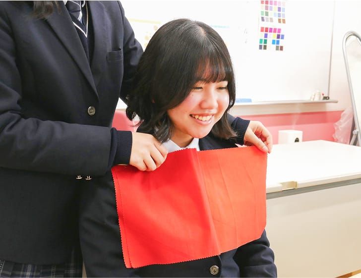 コーディネートの授業では、衣服の知識や接客のコツなど、アパレル業界で必要な販売やおしゃれの知識が身につきます。色彩学の授業では、色のもつ印象や意味・組み合わせ方を学び、広い分野で役立つセンスが育ちます。