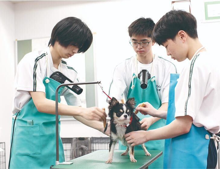 本校は高校でトリミングについて学べる県内唯一の学校です。本コースでは、ペットトリマーや動物看護師などの基礎となる知識や技術をいち早く学ぶことができます。早い時期から実践的な学習に取り組むことで、基本的な経験を身につけ、将来の選択肢を広げます。実習を通して、動物を扱う上で最も必要とされる「生命」を大切にする心を養います。