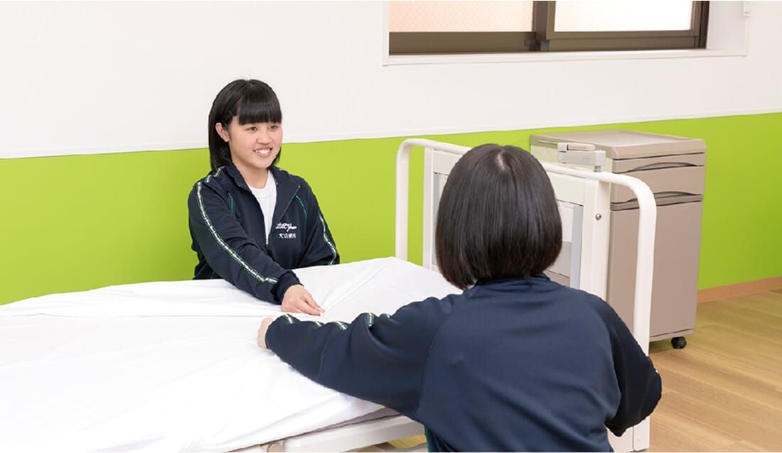 介護実習を通して、ベッドメイキング・食事介助・入浴介助・排泄介助など介護に必要な知識、介助技術を学びます。3年次になると福祉施設での介護実習を行い、ご利用者様の目線に立ち、触れ合いを通じてより専門的な技術を学びます。